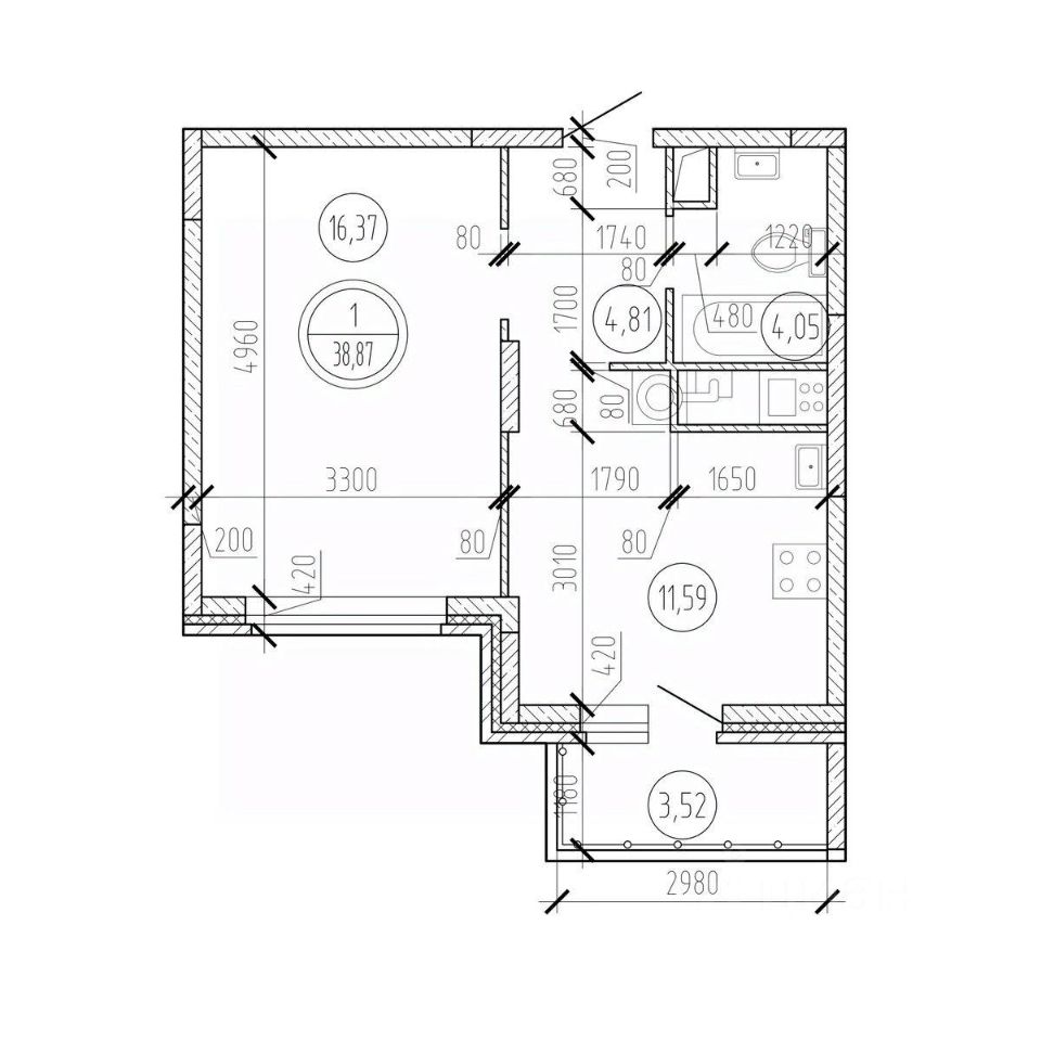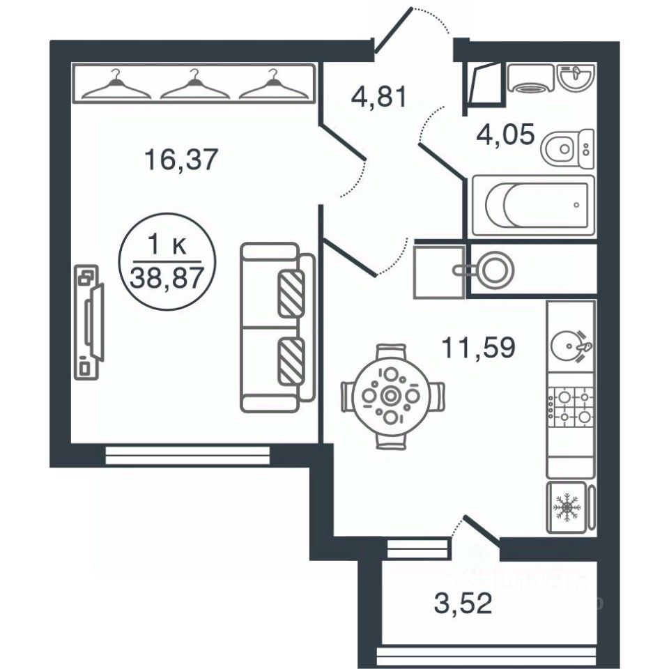Общая площадь38,87 м2