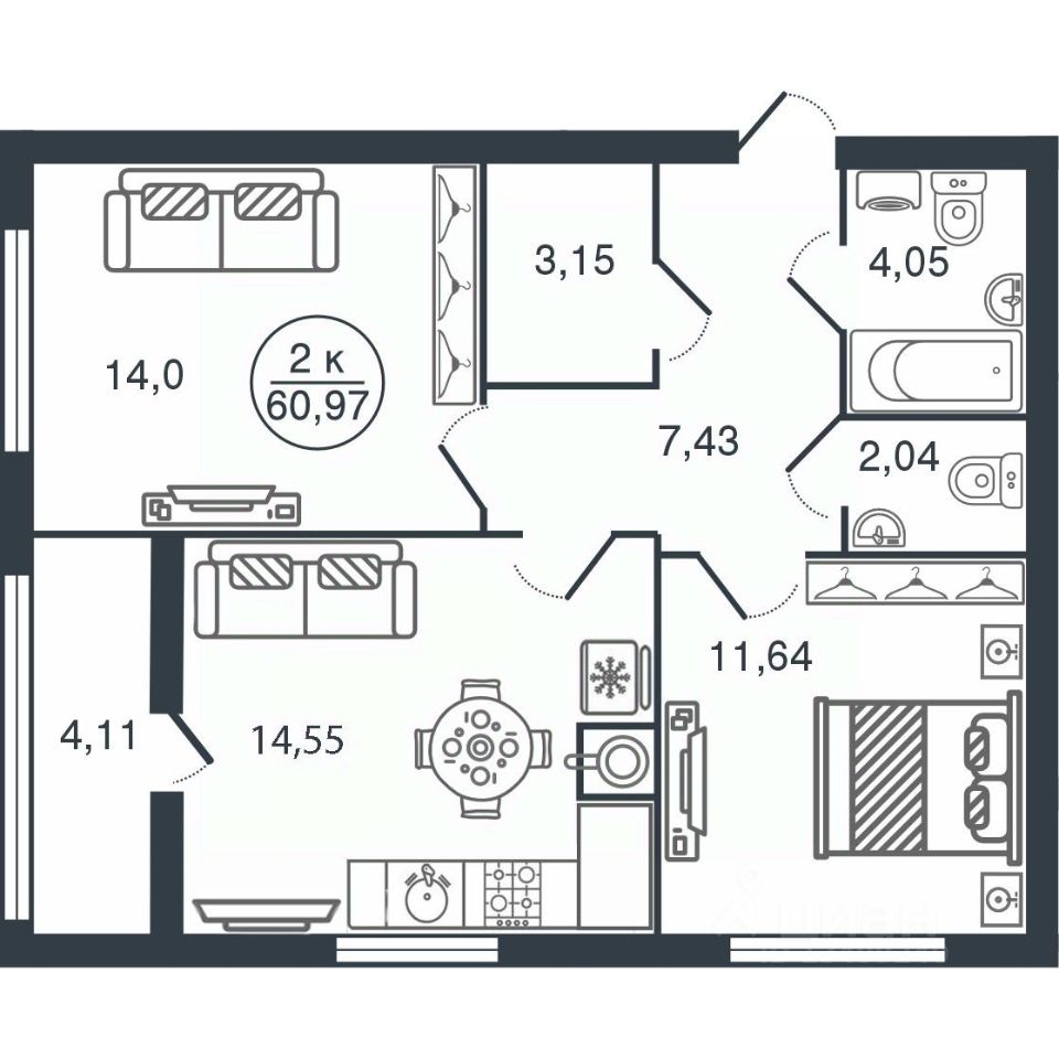 Общая площадь60,97 м2