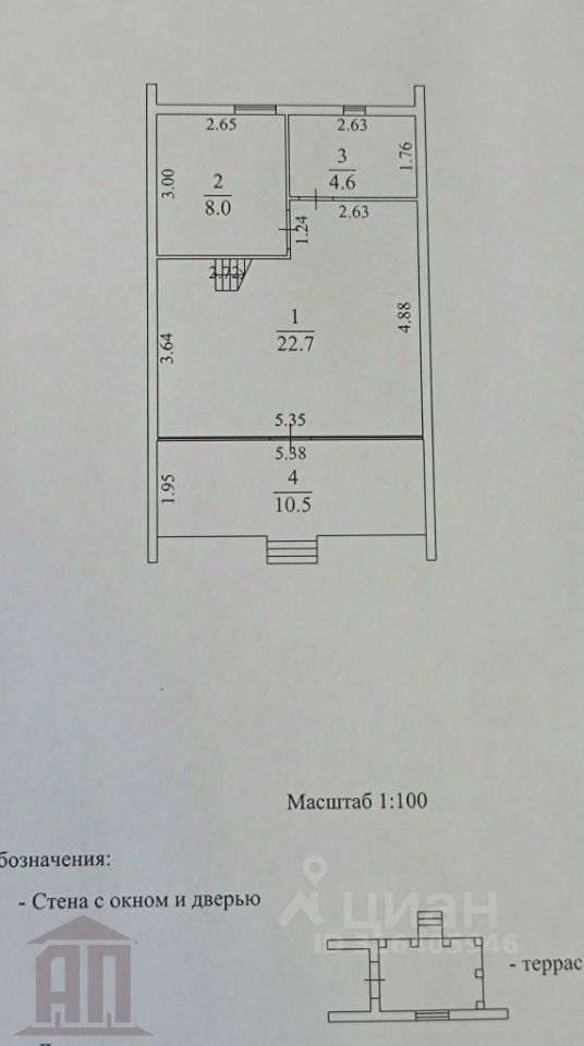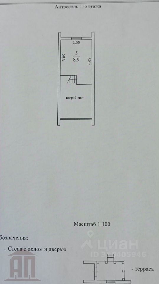 На 1 этаже: кухня-гостиная 31 м, санузел 4.6 м, лестница на второй этаж. На втором этаже - спальня 9 м.