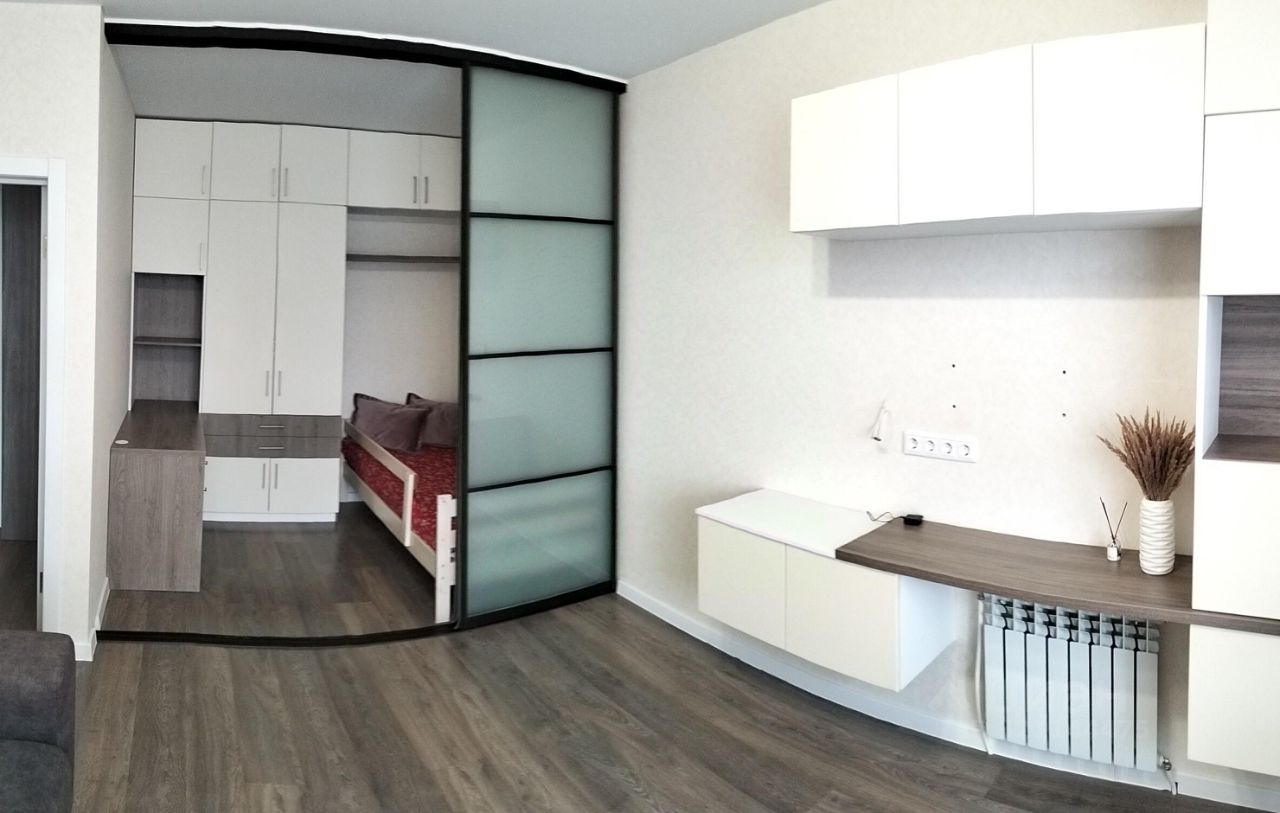 В квартире выполнена перепланировка на двухкомнатную со смежными комнатами, - зонирование возможно использовать, как спальное/игровое/рабочее место для ребенка.