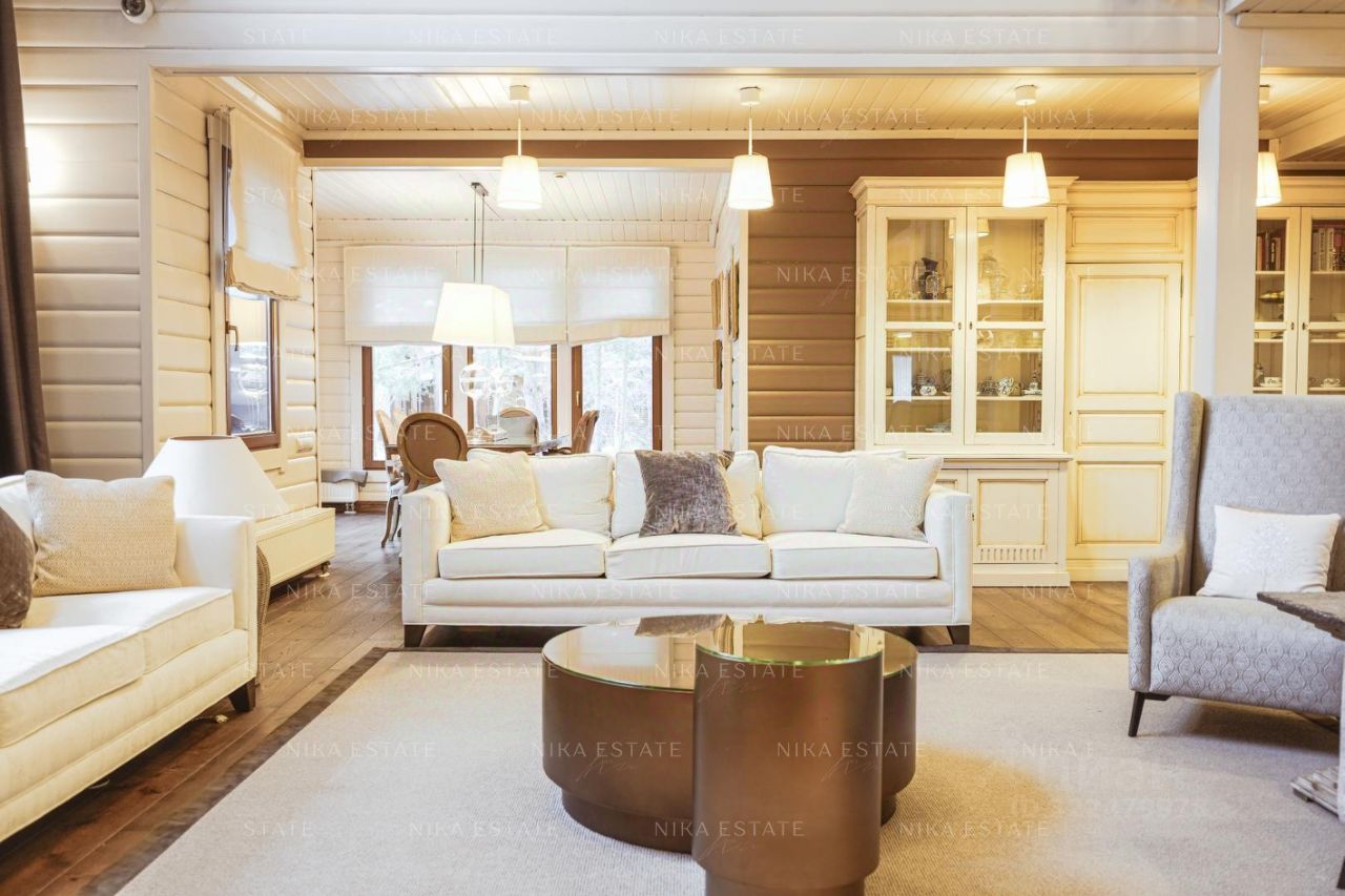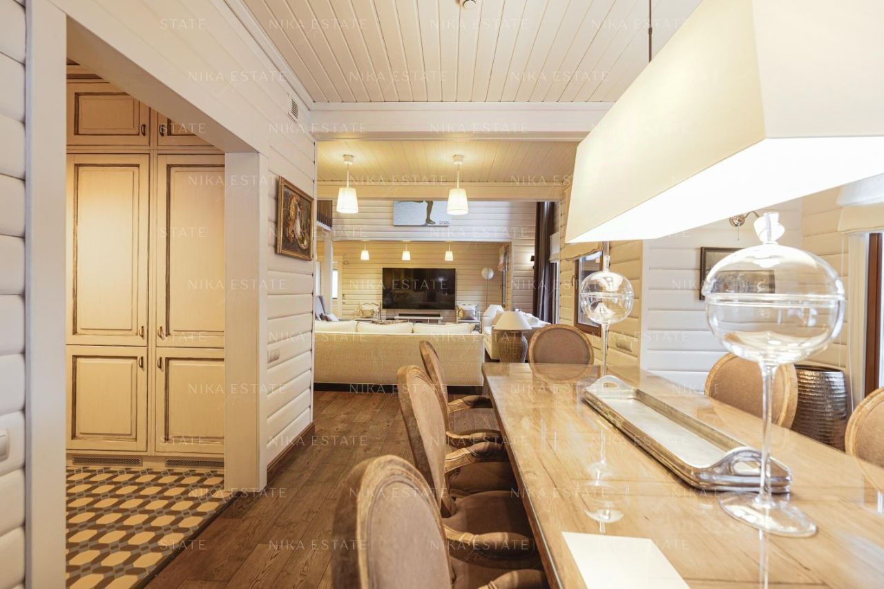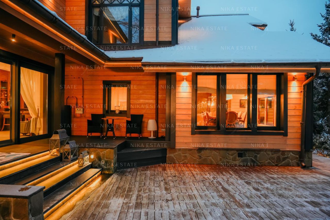 Дома в поселке выстроены в одном стиле, участки разделены между собой деревьями. Проведены центральные коммуникации: электричество, газ, вода, канализация, интернет. Дома построены из профилированного финского бруса Коntiо. В отделке использованы натуральные материалы: камень, мрамор, дерево. Коттеджи полностью меблированы и оснащены техникой от лучших европейских производителей. Заезжай и живи! В домах 10 спален, 9 санузлов. Множество мастер-спален, вместительные гардеробные, просторная гостиная, игровая зона, отдельная комната с домашним кинотеатром, каминный зал для уютных зимних вечеров, терраса для живописных завтраков и ужинов, винный погреб. Отдельный блок для персонала. Система умный дом и видеонаблюдение. Подогреваемые полы. Роскошный банный комплекс, где можно отдыхать душой и телом. Зона барбекю, беседка, на участке также есть поле с воротами для игры в футбол. Два газовых котла по 38 Квт. РАССТОЯНИЕ ДО ВОДЫ 280 МЕТРОВ. С ДВУХ СТОРОН ЛЕС.