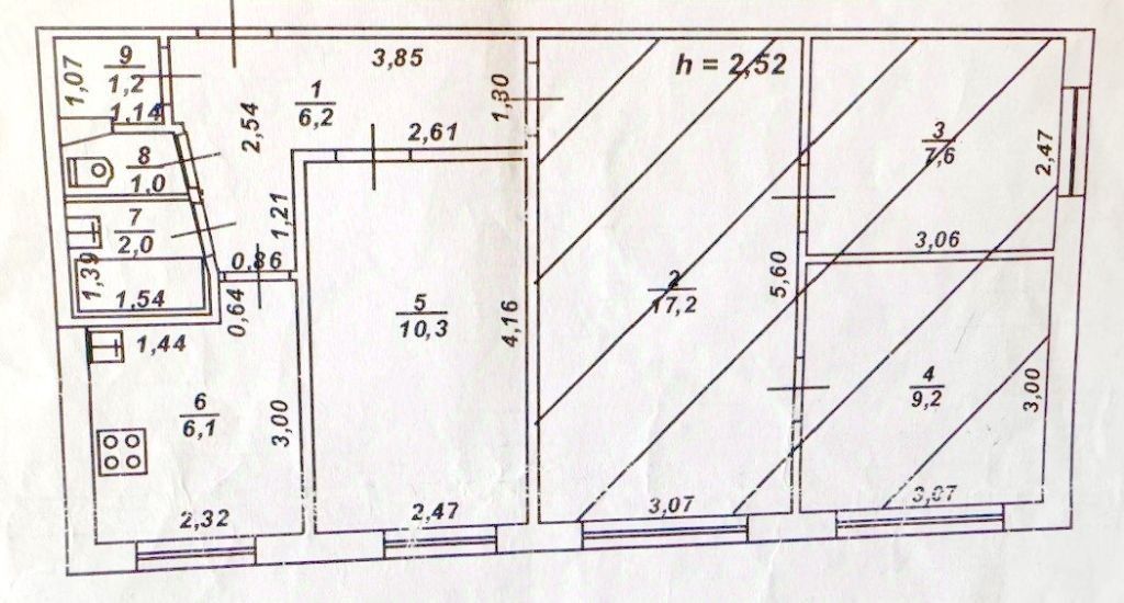 Общая площадь 60,8 кв.м., комнаты 17,2+7,6+9,2+10,3 кв.м., кухня 6,1 кв.м.