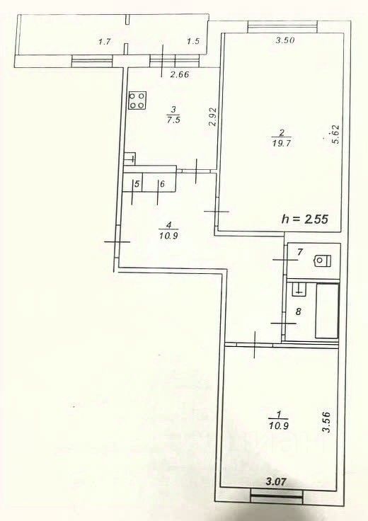 Квартира имеет продуманную планировку: две изолированные комнаты площадью 19,7 м² и 10,9 м², просторная кухня 7,5 м² с выходом на двойную застекленную лоджию , большая прихожая 10,9 м и раздельный санузел 2,5 и 1,2 м².