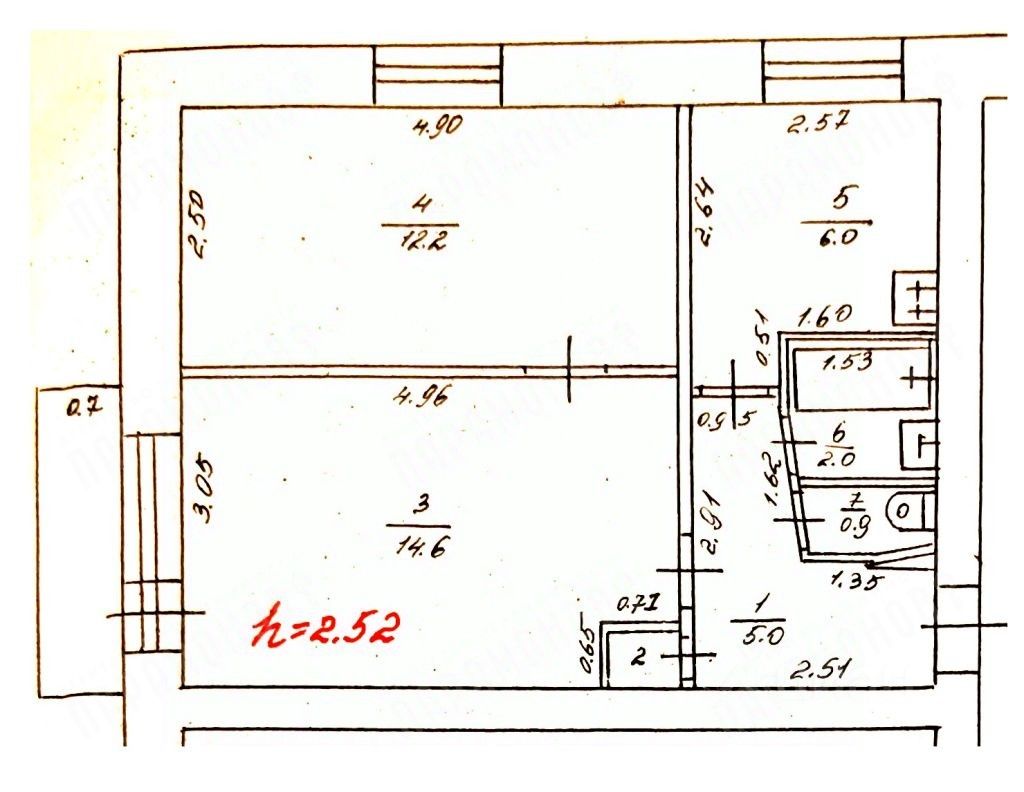 Общая площадь 41,8 кв.м., комнаты смежные 14,6 + 12,2 кв.м., кухня 6 кв.м.