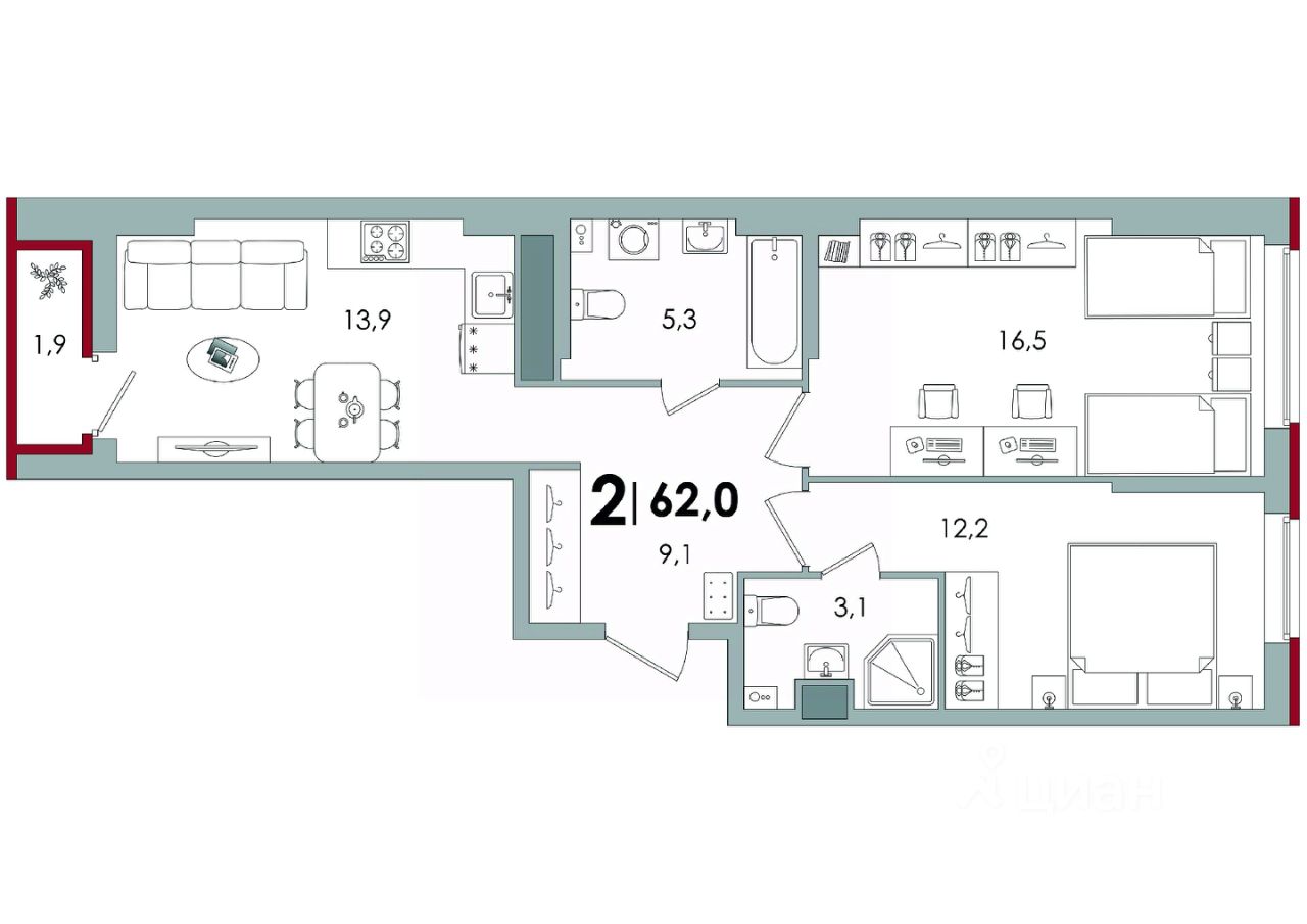 Общая площадь62 м2
