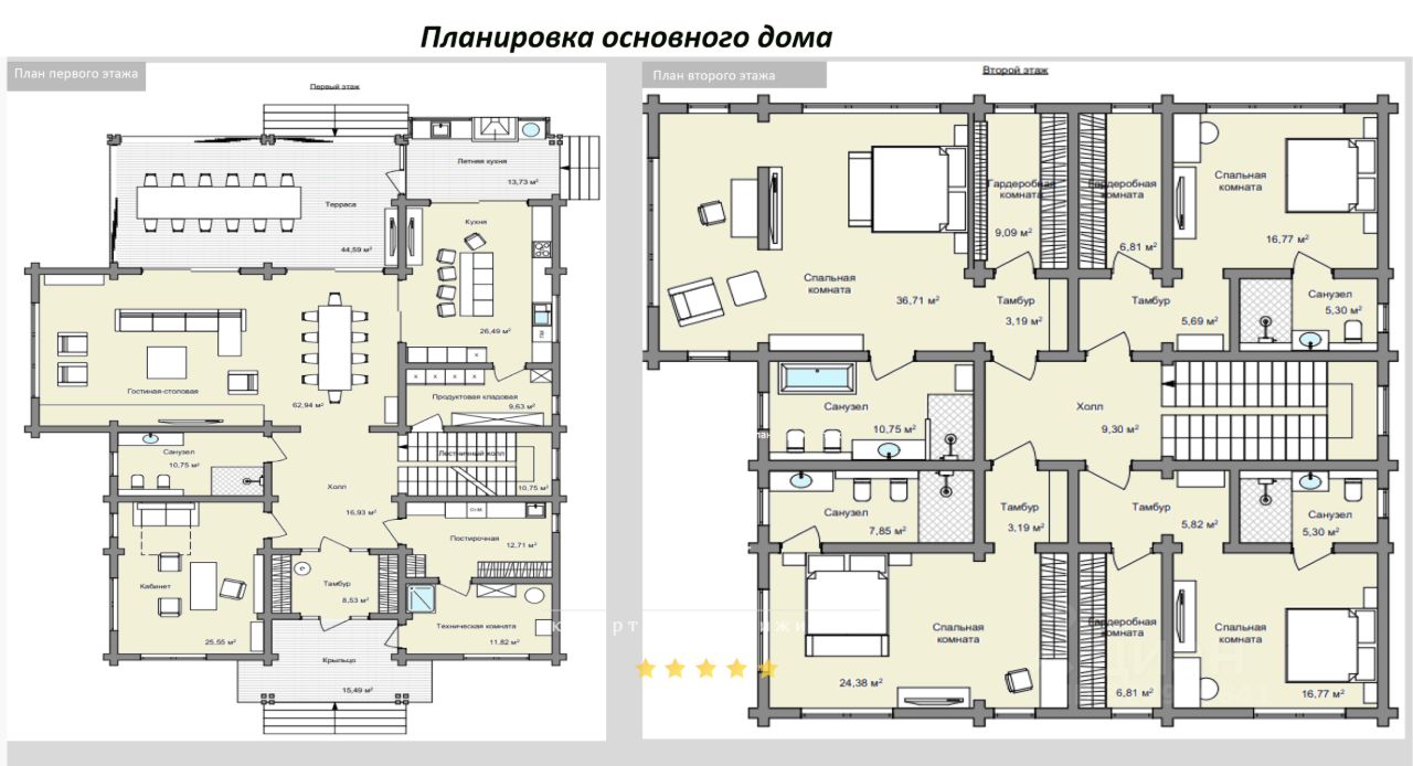 ПЛАНИРОВКА дома: 463 кв.м., включая террасу. Высота потолков-4 метра 1 этаж: Терраса: открытое пространство, идеальное место тёплых семейных ужинов и дружеских посиделок (58,32 кв.м.), Гостиная: просторное помещение (62,94 кв.м.) с панорамным остеклением и выходом на террасу, Кухня (26,49 кв.м.) с выходом на террасу в зону барбекю и продуктовую кладовую ( 9,63кв.м.) Кабинет, Ванная комната, Прачечная, Котельная. 2 этаж: Три просторные мастер -спальни (59,74 кв. м., 34,57 кв. м., 34,7 кв. м.) Гостевая спальня -35,42 кв.м.