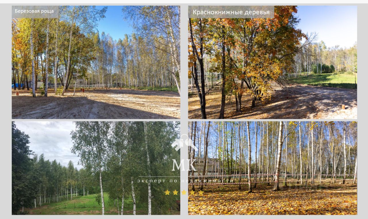 Участок выровнен, выполнен дренаж по всему периметру, с водоотведением за пределы участки. На участке есть небольшая березовая роща и несколько краснокнижных деревьев.