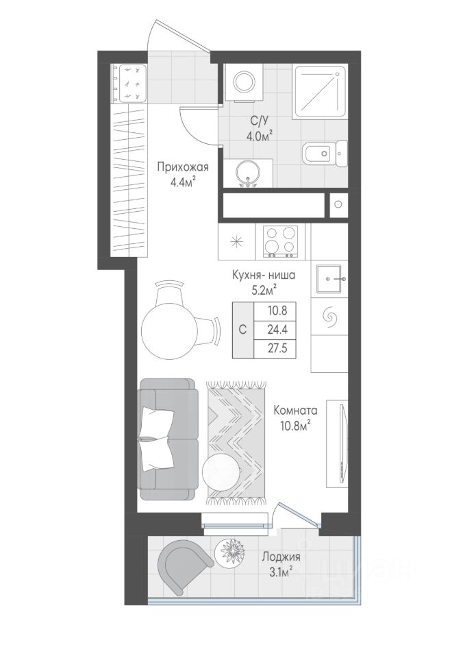 Квартира-студия - место, где легко обрести независимость, сосредоточиться на учебе или карьере и почувствовать себя по-настоящему дома. Планировка правильной геометрической формы позволяет максимально эффективно зонировать пространство и расставить мебель без ''мертвых'' зон. Этому способствует и ниша для гардероба, расположенная в прихожей. А просторный санузел позволит разместить и стиральную машину, и небольшой шкаф для хранения бытовых мелочей.