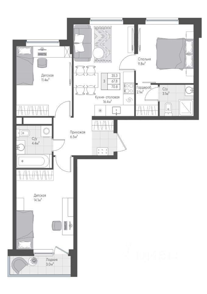 Продается квартира с кухней-гостиной и тремя изолированными комнатами. Для родителей есть современная мастер-спальня с собственным санузлом и гардеробной. В противоположной части квартиры расположены две детские правильной геометрической формы, в одной из них - выход на лоджию. Окна квартиры выходят во двор и на зону парковки.
