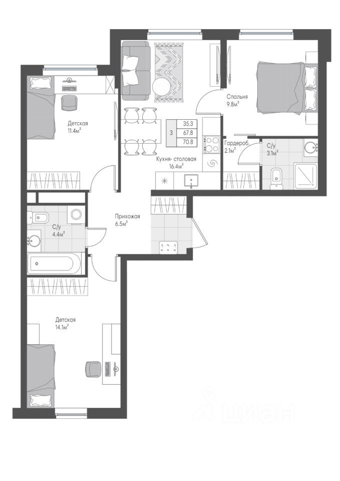 Общая площадь68,3 м2