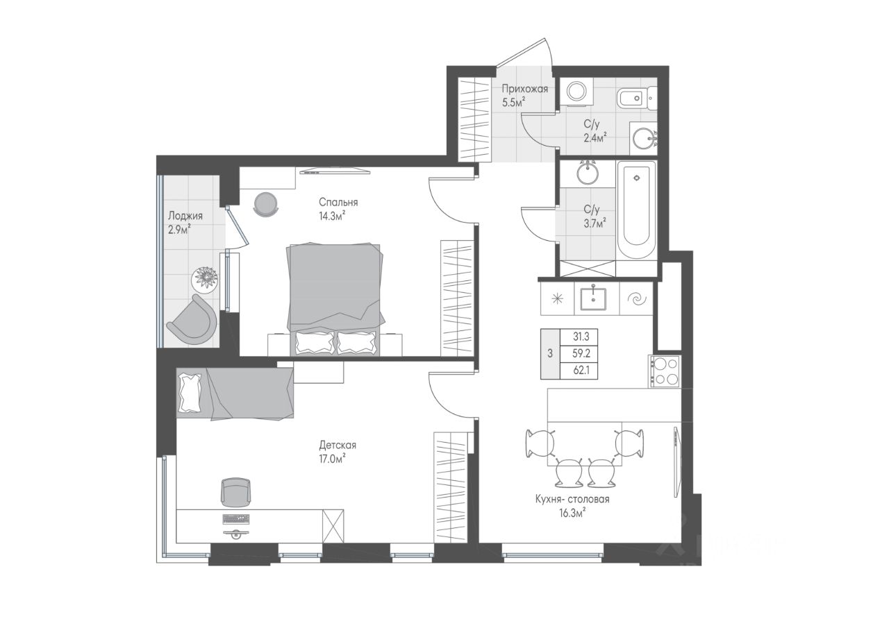 Продается 2-комнатная квартира с кухней-гостиной и двумя спальнями. Комнаты имеют правильную геометрическую форму, что позволяет разместить всю необходимую мебель. Два санузла для удобства всех членов семьи. В одной из комнат расположены 3 окна, что делает ее светлой и позволяет при желании сделать зонирование.