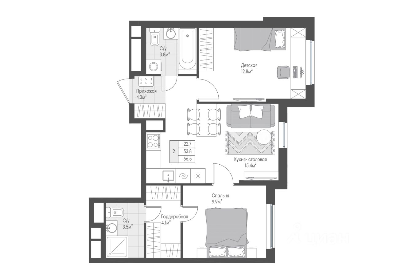 Продается квартира с кухней-гостиной и двумя спальнями по разные стороны от гостиной. Мастер-спальня с собственными гардеробной и санузлом. Окна выходят во двор, что позволит наблюдать за прогулкой детей во дворе.