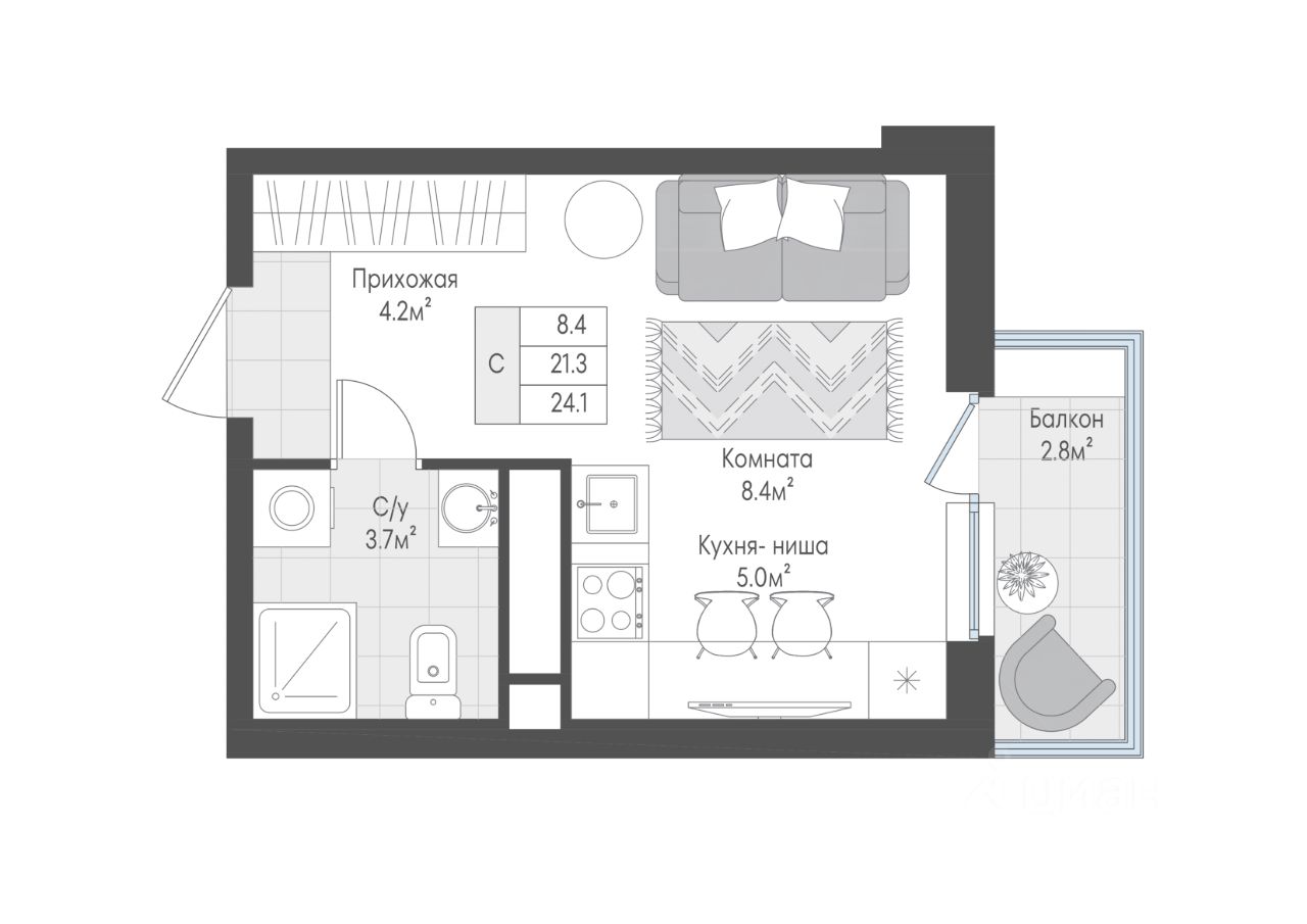 Квартира-студия - место, где легко обрести независимость, сосредоточиться на учебе или карьере и почувствовать себя по-настоящему дома. Планировка правильной геометрической формы позволяет максимально эффективно зонировать пространство и расставить мебель без ''мертвых'' зон. Этому способствует и ниша для гардероба, расположенная в прихожей. А просторный санузел позволит разместить и стиральную машину, и небольшой шкаф для хранения бытовых мелочей.