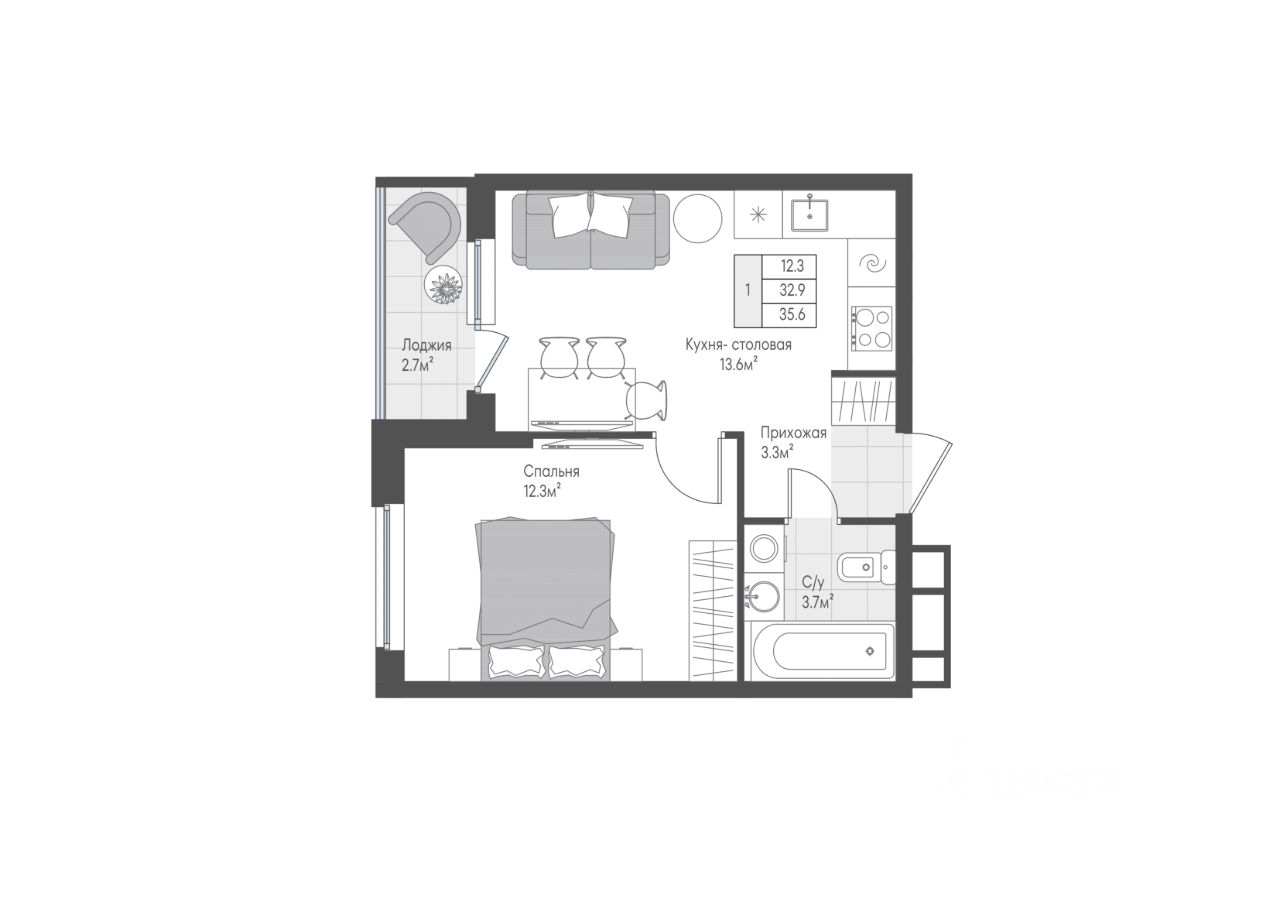Станьте обладателем уютной 1-комнатной квартиры с лоджией из кухни-гостиной. Окна выходят во двор. Совмещенный санузел имеет оптимальную площадь, где можно разместить стиральную машину и шкаф для бытовых мелочей.