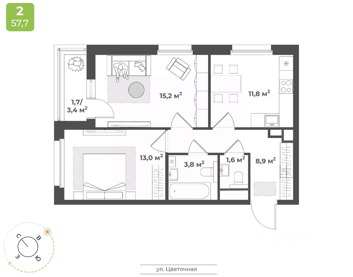 Продаётся 2-комнатная квартира в строящемся доме (Дом 2), срок сдачи: IV-кв. 2026, общей площадью 56 кв.м., на 16 этаже. Будущий жилой квартал - это уникальный для Твери проект, обеспеченный всем необходимым для жизни: благоустроенный двор без автомобилей, детские площадки для разных возрастов, зоны для спорта, продуманные планировки квартир. На территории комплекса появится новая школа на 1224 мест и центральный бульвар. Квартал расположен в Заволжском районе на пересечении улиц 2-я Красина и Цветочная. В месте, где транспортными магистралями связаны сразу пять микрорайонов в Заволжье: ближнее Заволжье, Соминка, Радужный, МЖК и Юность. Что обеспечивает жителям квартала удобную транспортную доступность. Кампус ТвГУДетский сад 5Городская клиническая поликлиника 7Фитнес-клубМагазины продуктов питанияПочтовое отделение 10Бассейн ''Парус''Напротив квартала планируется строительство школы на на 1224 местаДома расположены так, чтобы у жителей создавалось ощущение уюта и безопасного пространства. Все, что нужно для спокойного и тихого отдыха, находится во дворе, а подход к магазинам, парикмахерским, салонам услуг - с внешней стороны квартала. Двор внутри квартала принадлжеит только жителям, в нем нет случайных прохожих и проезжающих автомобилей. Мы выбрали проект, который предполагает, что дома в квартале будут разной высоты - от 9 до 25 этажей. Это позволяет избежать монотонности в застройке, а кроме того, благодаря чередованию высоких и низких секций во дворе больше солнца.