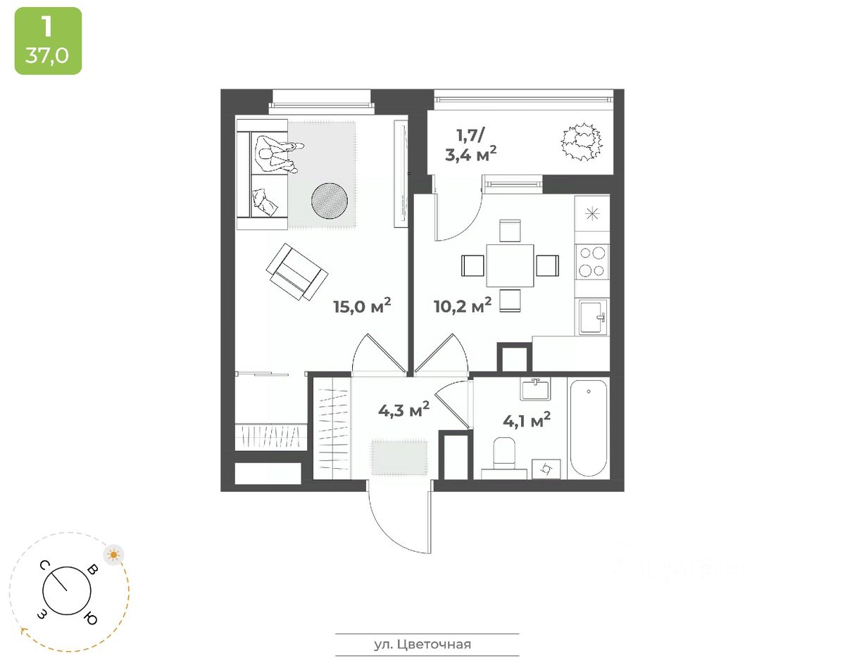 Продаётся 1-комнатная квартира в строящемся доме (Дом 2), срок сдачи: IV-кв. 2026, общей площадью 35.3 кв.м., на 17 этаже. Будущий жилой квартал - это уникальный для Твери проект, обеспеченный всем необходимым для жизни: благоустроенный двор без автомобилей, детские площадки для разных возрастов, зоны для спорта, продуманные планировки квартир. На территории комплекса появится новая школа на 1224 мест и центральный бульвар. Квартал расположен в Заволжском районе на пересечении улиц 2-я Красина и Цветочная. В месте, где транспортными магистралями связаны сразу пять микрорайонов в Заволжье: ближнее Заволжье, Соминка, Радужный, МЖК и Юность. Что обеспечивает жителям квартала удобную транспортную доступность. Кампус ТвГУДетский сад 5Городская клиническая поликлиника 7Фитнес-клубМагазины продуктов питанияПочтовое отделение 10Бассейн ''Парус''Напротив квартала планируется строительство школы на на 1224 местаДома расположены так, чтобы у жителей создавалось ощущение уюта и безопасного пространства. Все, что нужно для спокойного и тихого отдыха, находится во дворе, а подход к магазинам, парикмахерским, салонам услуг - с внешней стороны квартала. Двор внутри квартала принадлжеит только жителям, в нем нет случайных прохожих и проезжающих автомобилей. Мы выбрали проект, который предполагает, что дома в квартале будут разной высоты - от 9 до 25 этажей. Это позволяет избежать монотонности в застройке, а кроме того, благодаря чередованию высоких и низких секций во дворе больше солнца.
