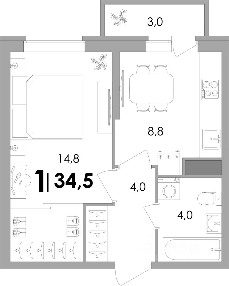 Квартира в эко-квартале комфорт-класса плюс ''Есенинские поля'': • Кирпичный дом с панорамным остеклением с 5 этажа. • Закрытая территория с круглосуточной системой видеонаблюдения. • Рядом ТЦ ''Есенин'' и термальный комплекс ''Новые Термы'' с бассейнами. • Порядок на территории поддерживает собственная управляющая компания. • Умные, развивающие детские площадки и спортзал под открытым небом. • Зелёный двор-парк и лаундж-зоны для отдыха на природе. • Филиал городской поликлиники. • Безбарьерная среда для мам с колясками, пожилых и маломобильных людей: вход с уровня земли, просторный проходной лифт. • Скейт площадка. • Детский сад ''Новые дети''.